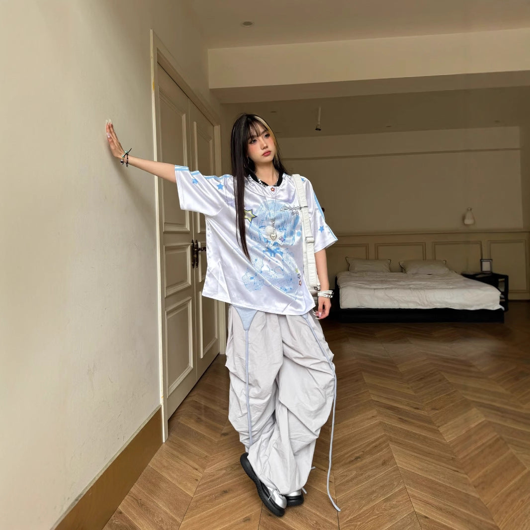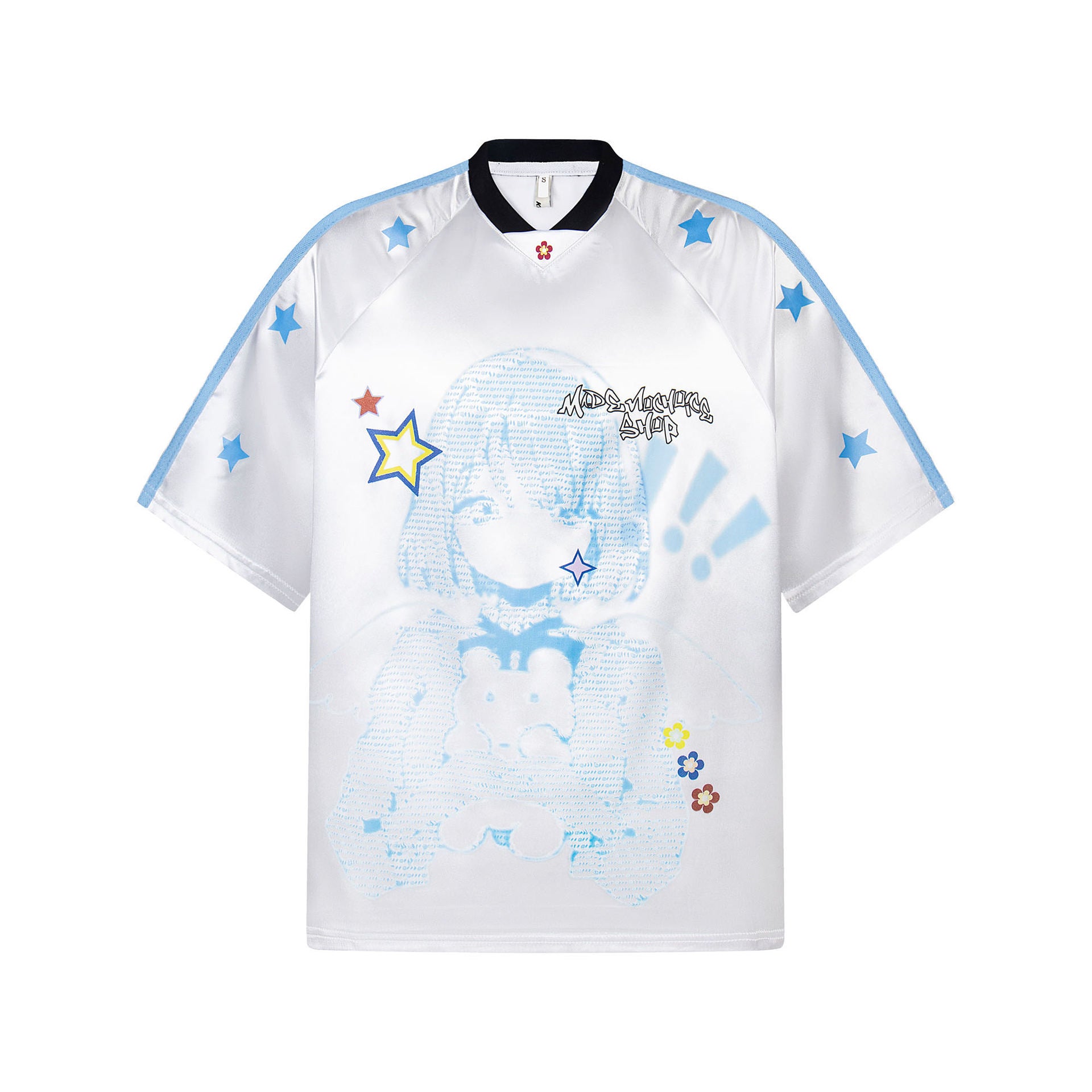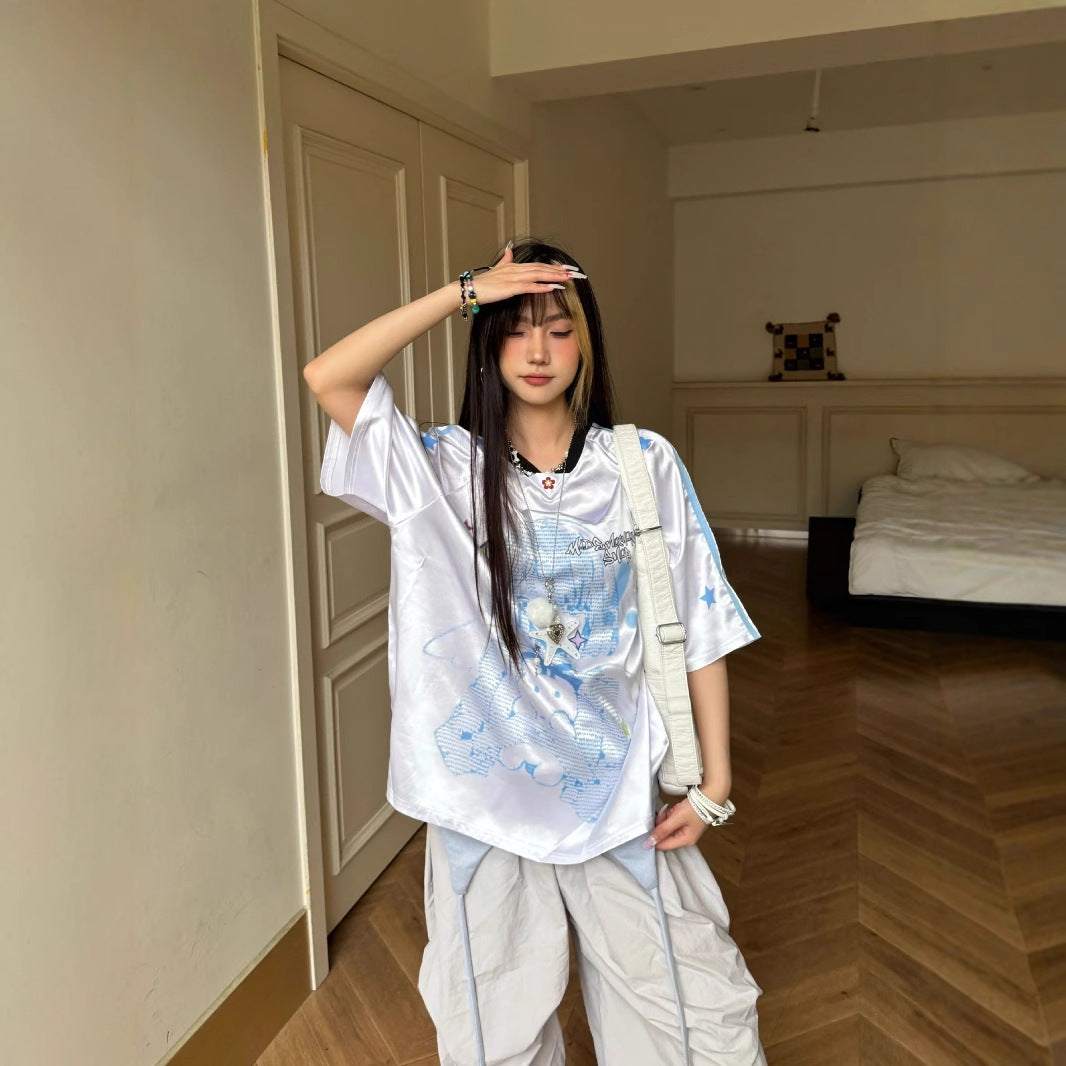 Cartoon Girl Jersey Short Sleeve Women's Summer Y2K Printed Loose T-Shirt Stitched V-Neck Casual Niche Top