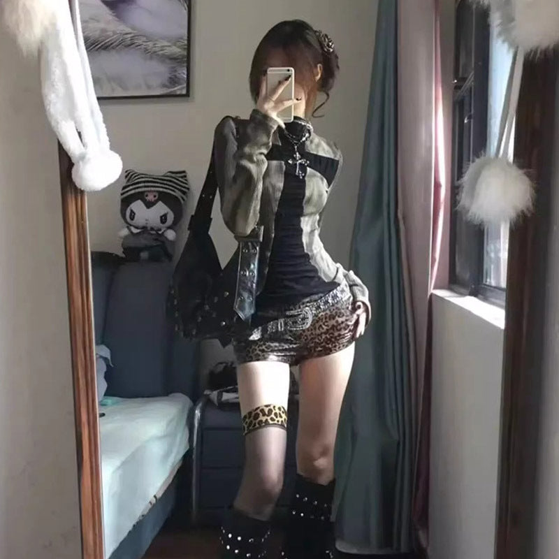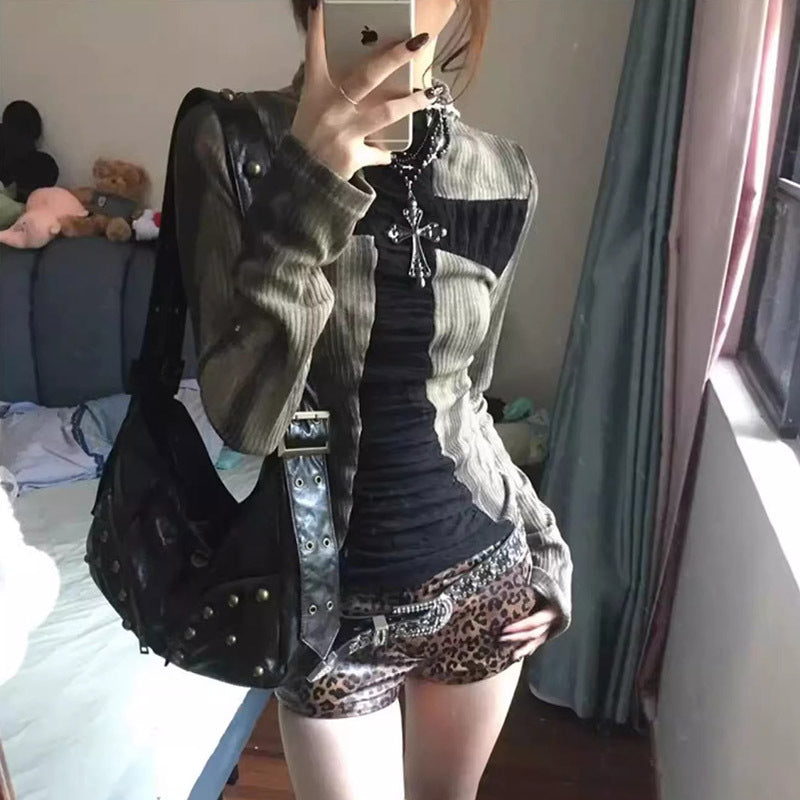 Spring and Autumn Women's New Y2K Babes Millennial Retro Punk Cross Contrast Stitch Long Sleeve T-Shirt Top